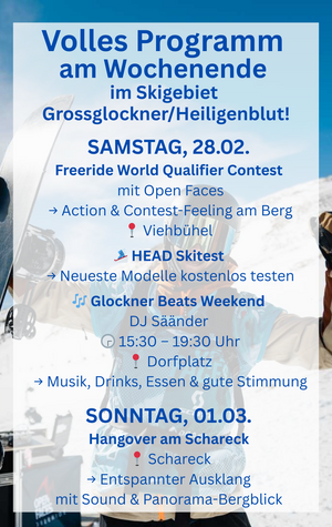 Auch in dieser Wintersaison erwartet euch ein abwechslungsreiches Veranstaltungsprogramm. Ob der Freeride World Qualifier Contest mit Open Faces, die Glockner Beats Weekends mit vielfältigen DJ-Acts, unser exklusiver Blick hinter die Kulissen, die Bergnacht oder viele weitere Highlights – in Heiligenblut am Großglockner ist für jeden etwas dabei.